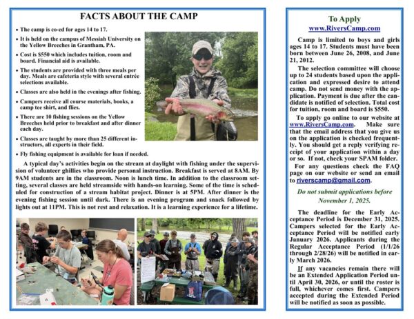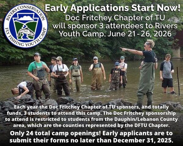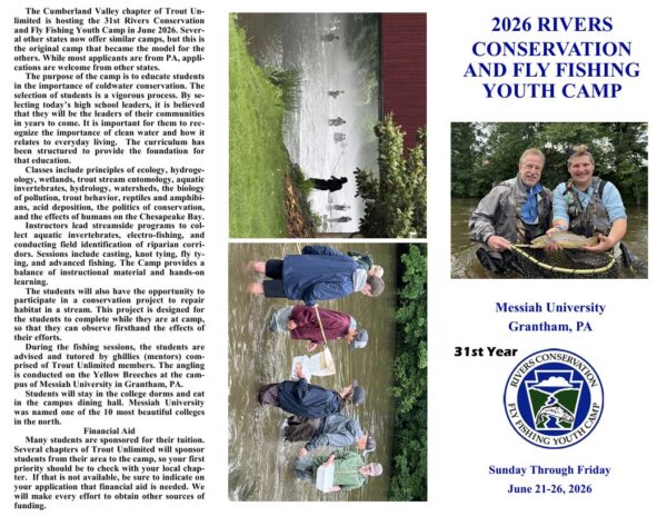 DFTU will once again be sponsoring 3 participants from Dauphin and Lebanon counties. Cumberland Valley Trout Unlimited Rivers Conservation and Fly Fishing Youth Camp, held at Messiah University in Grantham, PA. Any teenager with an interest can apply; they do not need to be pursuing a career in fields of stream conservation.